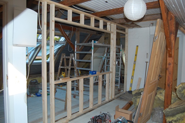 Opbygningen på 1. sal undervejs. Den gamle kvist er blevet erstattet af 2 Velux vinduer.
